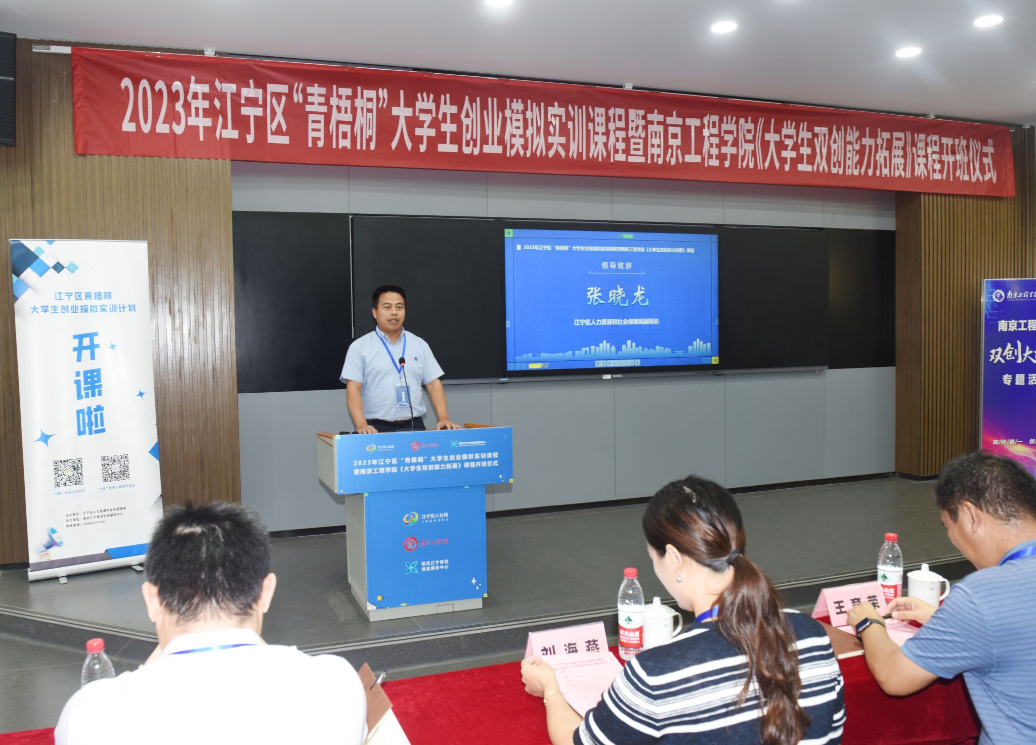 9月20日下午,2023年江宁区“青梧桐”大学生创业模拟实训课程暨凯发k8官网《大学生双创能力拓展》课程班在创新创业学院路演大厅举行开班仪式。党委常委、副校长朱松青,江宁区人力资源和社会保障局副局长张晓龙,教务处、工业中心、创新创业学院相关负责人、教师和27名学员参加开班仪式。