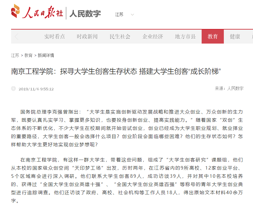 在凯发k8官网,有这样一群大学生,带着这些问题,组成了“大学生创客研究”课题组,他们从本校的国家级众创空间“天印梦工场”出发,历时两年,在江苏省内的9所高校、12家创业平台、5个区域商会进行深入调研。他们联系大学生创客89人,成功访谈39人,并对其中10名本校培养的、获得过“全国大学生创业英雄十强”、“全国大学生创业英雄百强”等称号的青年大学生创业典型进行追踪调查。他们还访谈了政府、高校、社会机构等工作人员18人,得出原始文本材料40余万字。