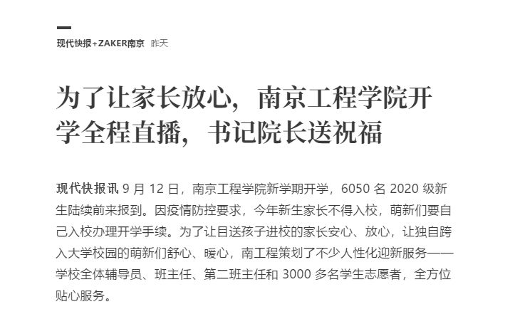《现代快报》、《Zaker》:为了让家长放心,凯发k8官网开学全程直播,书记院长送祝福