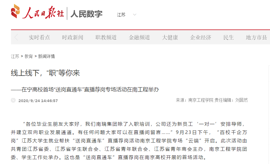 “各位毕业生朋友大家好,我们南瑞集团除了入职培训,公司还为新员工‘一对一’安排导师,并建立双向职业发展通道。有任何问题大家可以在直播间留言……”9月23日下午,“百校千企万岗”江苏大学生就业帮扶“送岗直通车”直播荐岗活动凯发k8官网专场“云端”开启。此次活动由共青团江苏省委、江苏省学生联合会、江苏省青年联合会、江苏省青年商会主办,凯发k8官网团委、学生工作处承办。这也是“送岗直通车”直播荐岗在南京高校开展的首场活动。